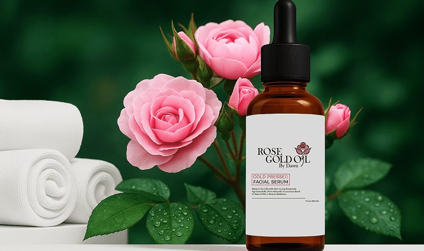 Discover Rose Gold Oil By Dawn. A luxurious, multi-correctional facial oil crafted with natural botanicals, pure rosehip and age-fighting antioxidants. Designed to hydrate, smooth and restore balance, it leaves your skin luminous, soft and visibly younger with every drop.